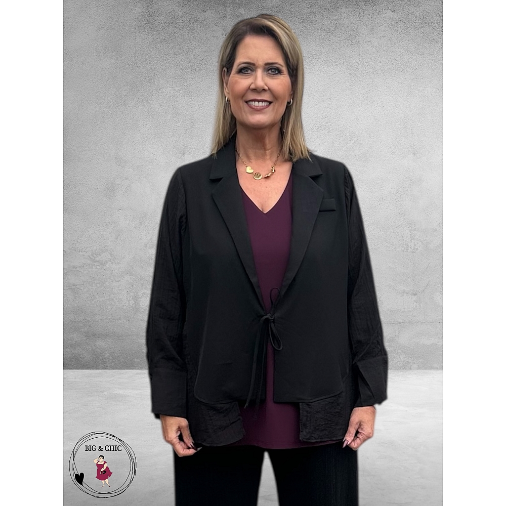In het midden wordt de blazer stijlvol bij elkaar gebonden met twee subtiele touwtjes, wat zorgt voor een speels maar elegant silhouet.