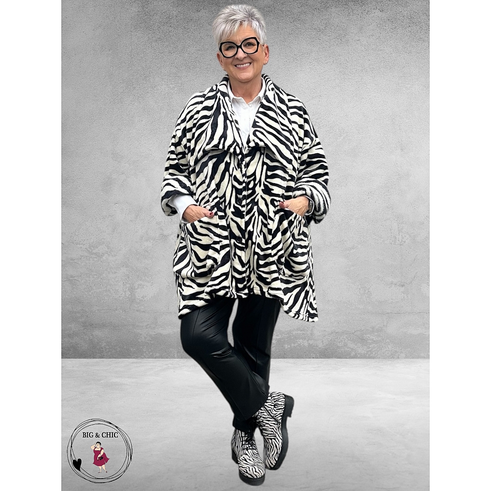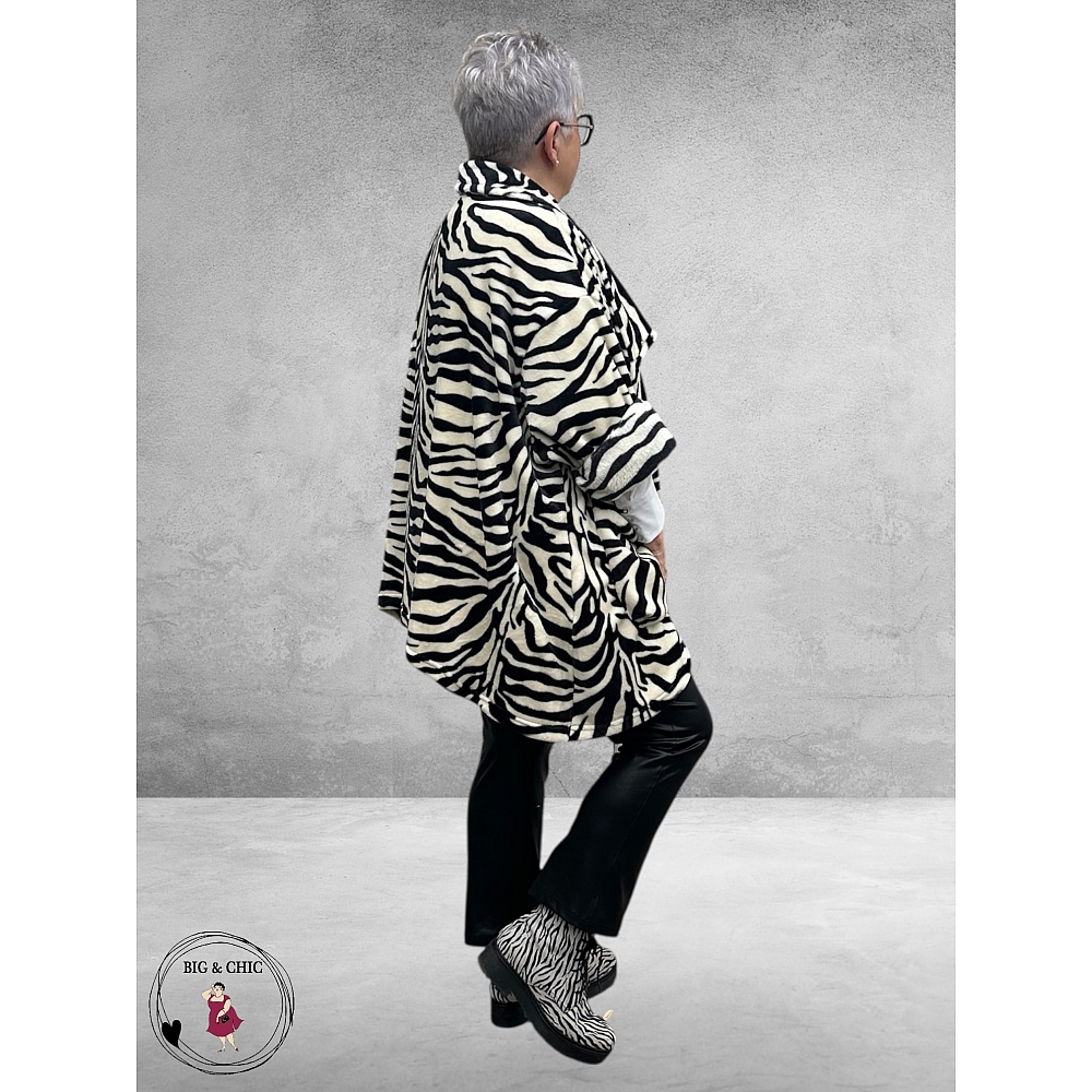 AKH Sansa Jas Zebra Print – Kort A-lijn Model met Lange Mouwen en Grote KraagDeze modieuze jas in zwart-witte zebra print combineert een uitgesproken design met heerlijk draagcomfort.