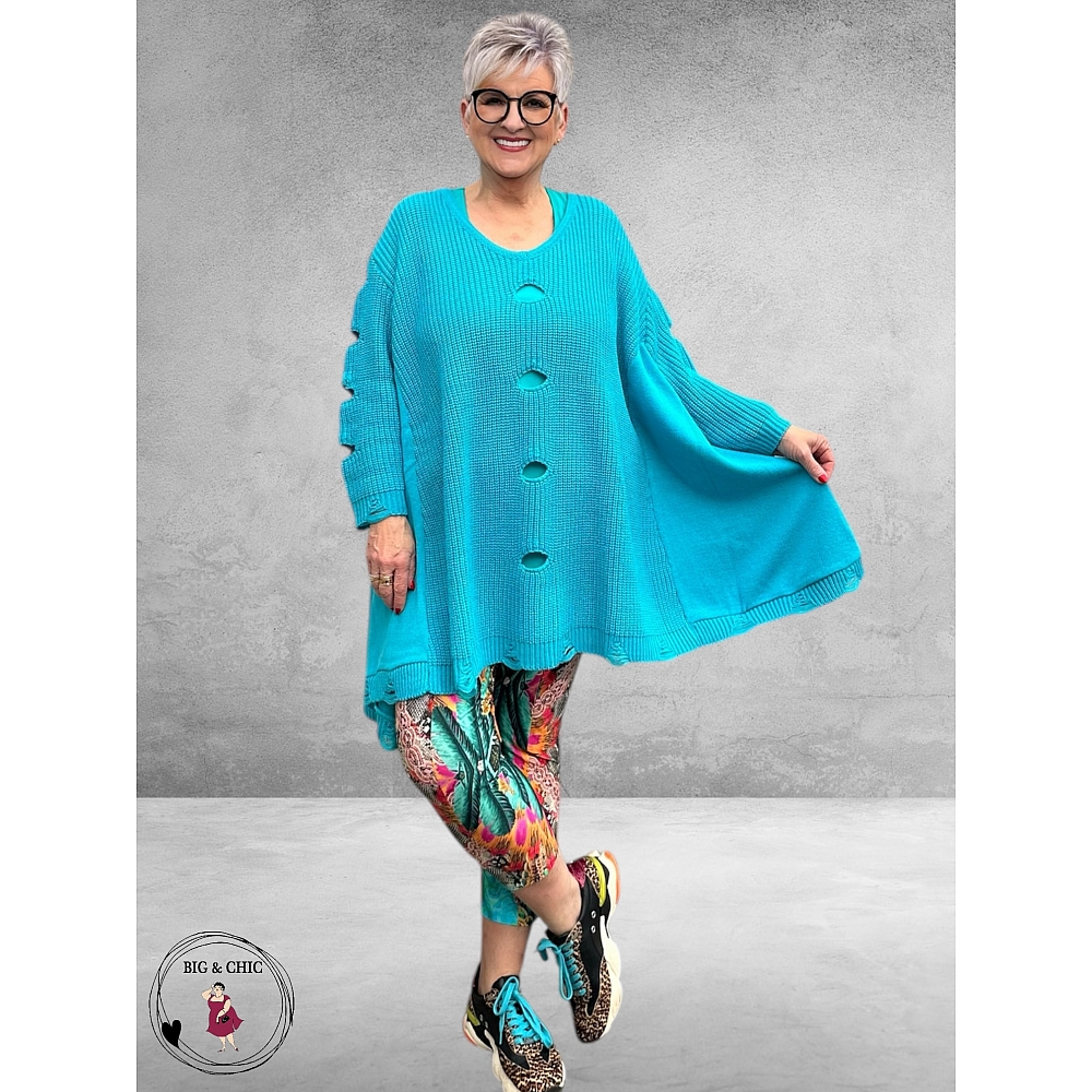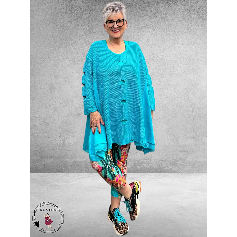 Het oversized en super wijde model zorgt voor een nonchalante, stijlvolle uitstraling, terwijl de gave gaten in het midden van het voorpand en langs de lange mouwen een speelse en unieke twist geven.