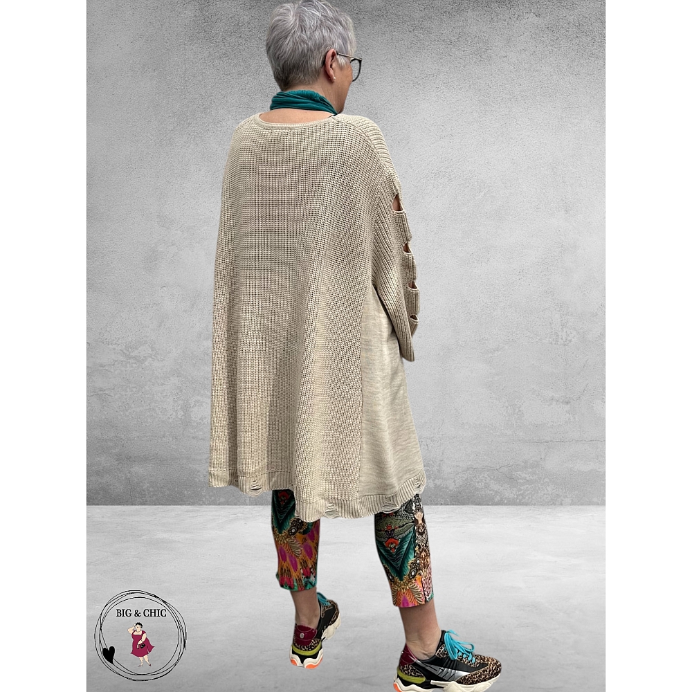 Het oversized en super wijde model zorgt voor een nonchalante, stijlvolle uitstraling, terwijl de gave gaten in het midden van het voorpand en langs de lange mouwen een speelse en unieke twist geven.