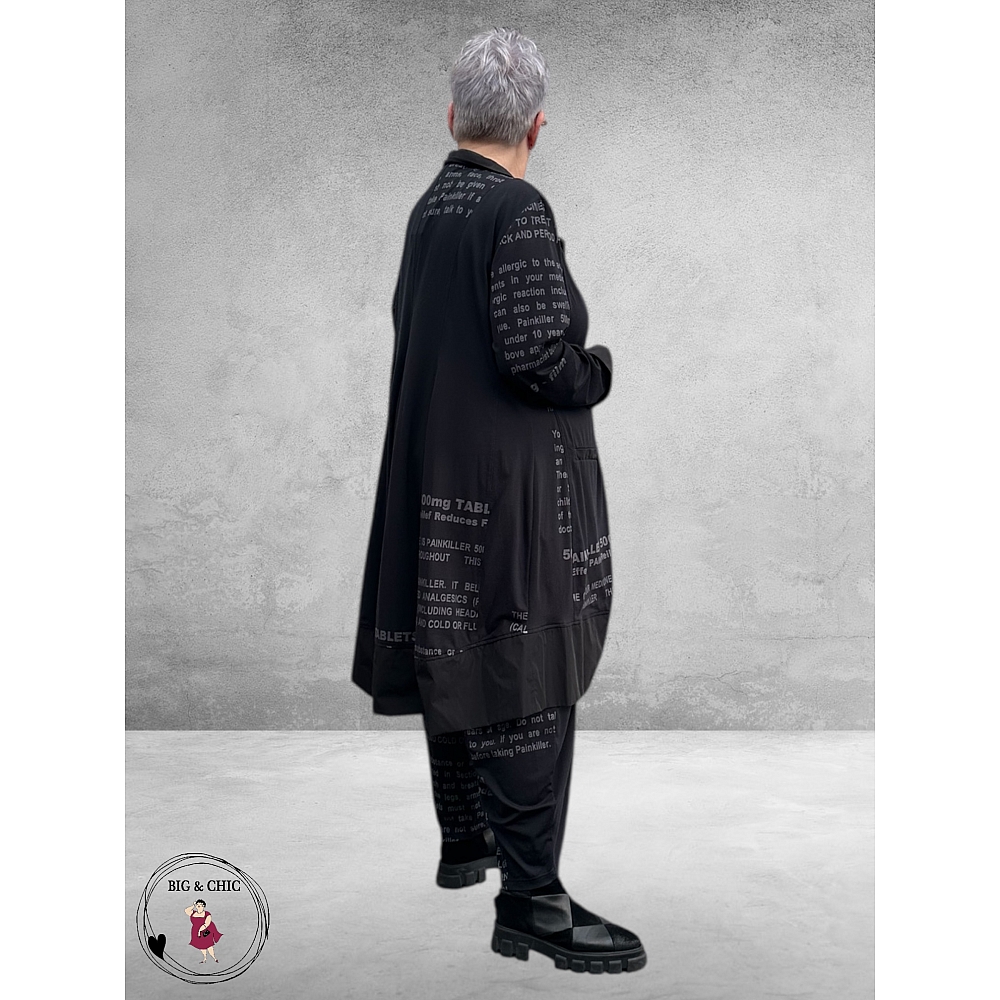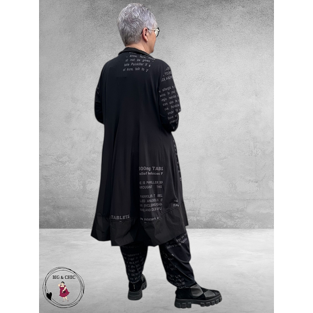 Unieke details maken dit blouse/jasje bijzonder: een opvallende witte tekststrook siert de voorkant en de achterzijde, en de brede glanzende strook onderaan geeft een luxe, speels accent.