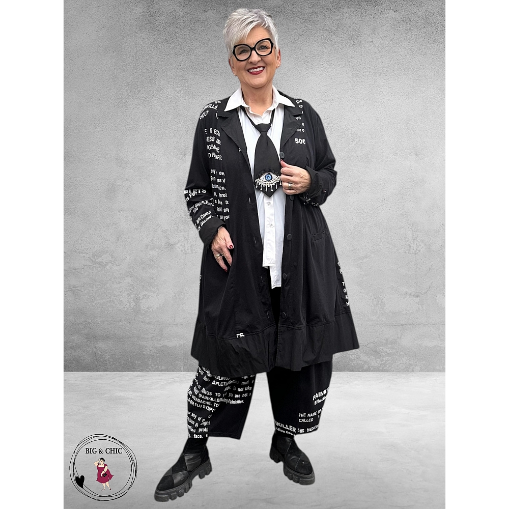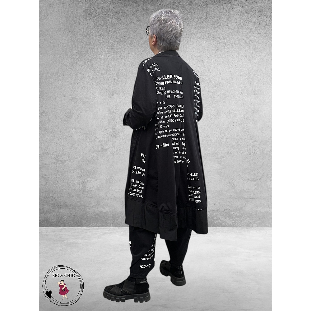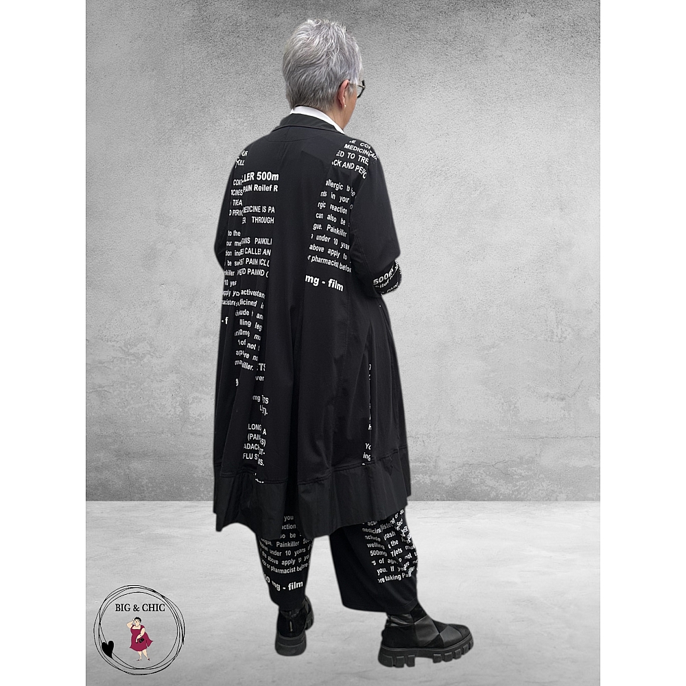 Unieke details maken dit blouse/jasje bijzonder: een opvallende witte tekststrook siert de voorkant en de achterzijde, en de brede glanzende strook onderaan geeft een luxe, speels accent.