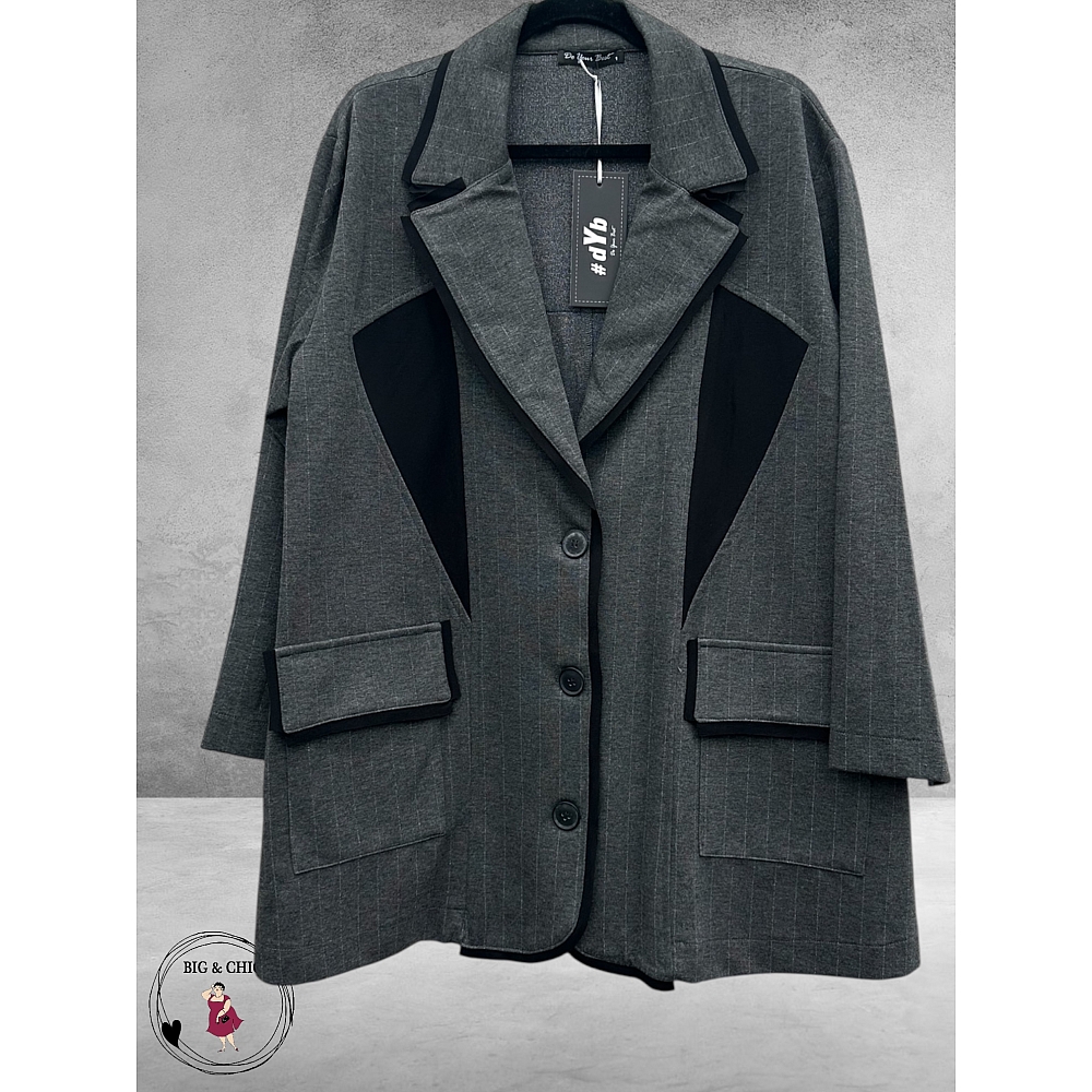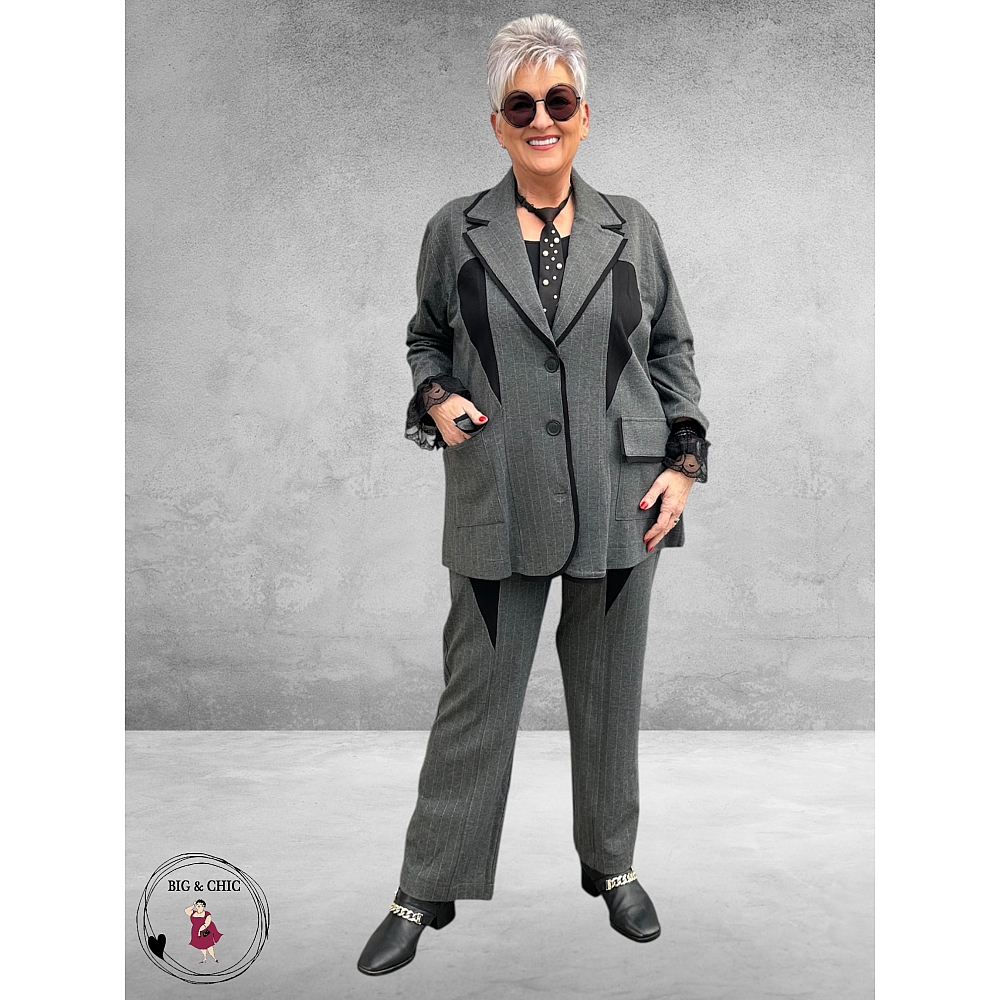 De blazer is uitgevoerd in een elegant grijze tint met subtiele zilveren strepen die het geheel een luxe uitstraling geven.