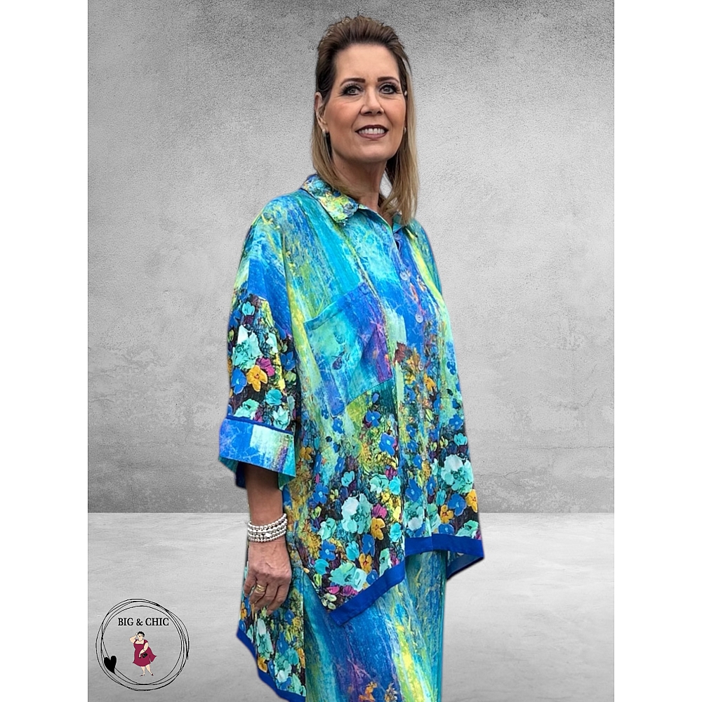 De blouse is wijd en oversized gesneden, met een kortere voorkant en een langere achterkant voor een speels en flatterend effect.