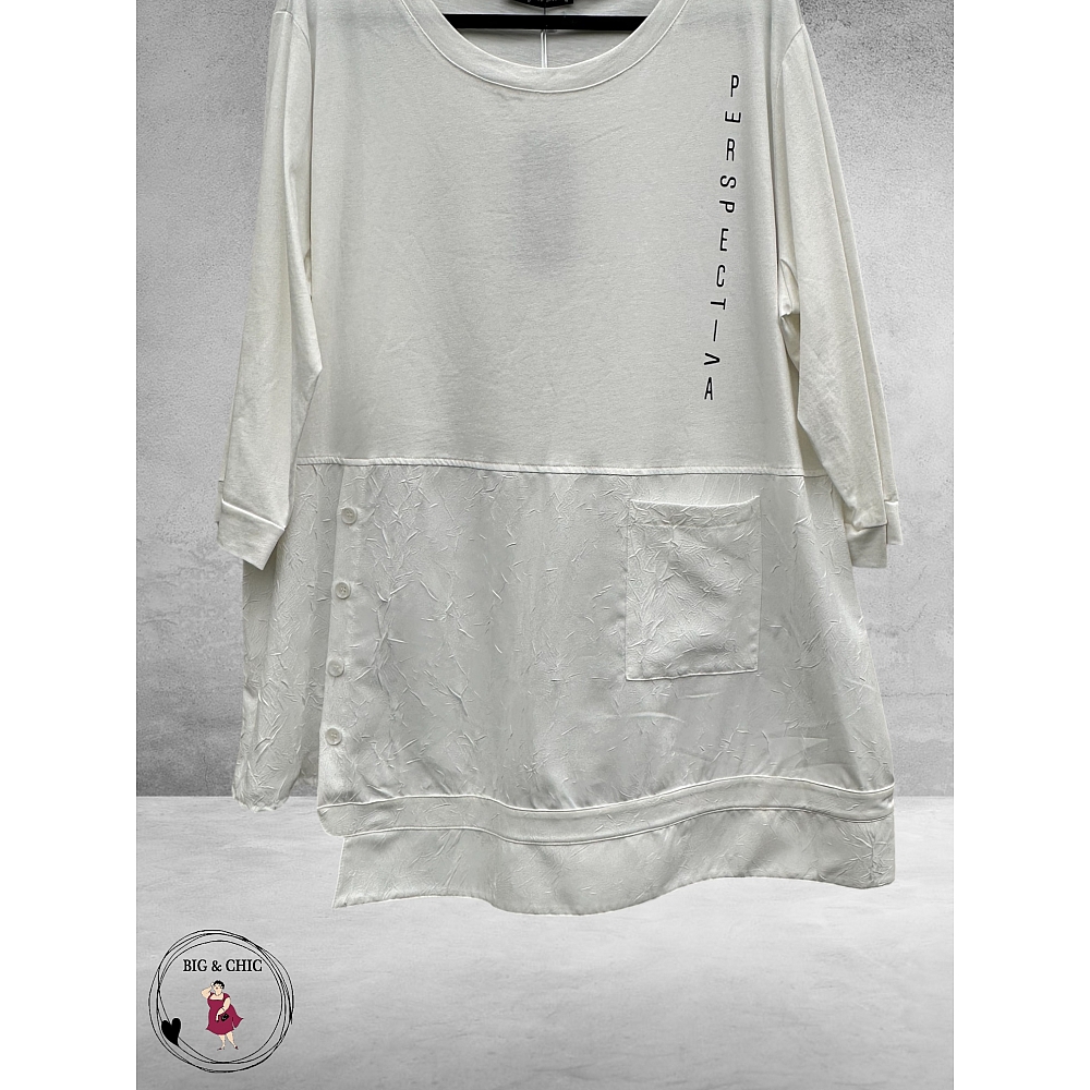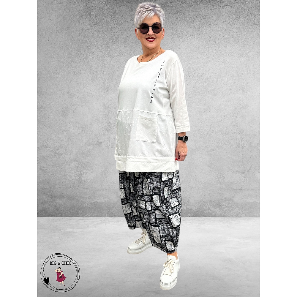 Aan de bovenkant oogt het als een klassiek shirt met ronde halslijn, driekwart mouwen en een decente letterprint op de linker voorkant.