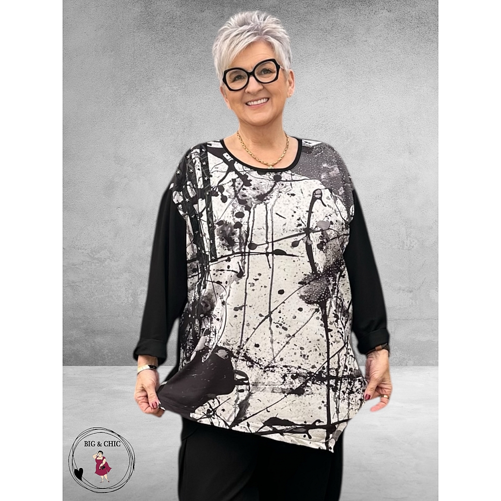 Frenzi shirt – Zwart met zwart-witte verfspatten en strassdetails.