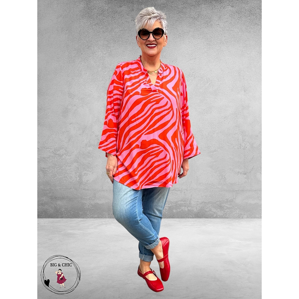 Een echte blikvanger in een te gekke kleurencombinatie van pink en oranje. Deze blouse straalt energie en vrouwelijkheid uit en is perfect voor het voorjaar en de zomer.