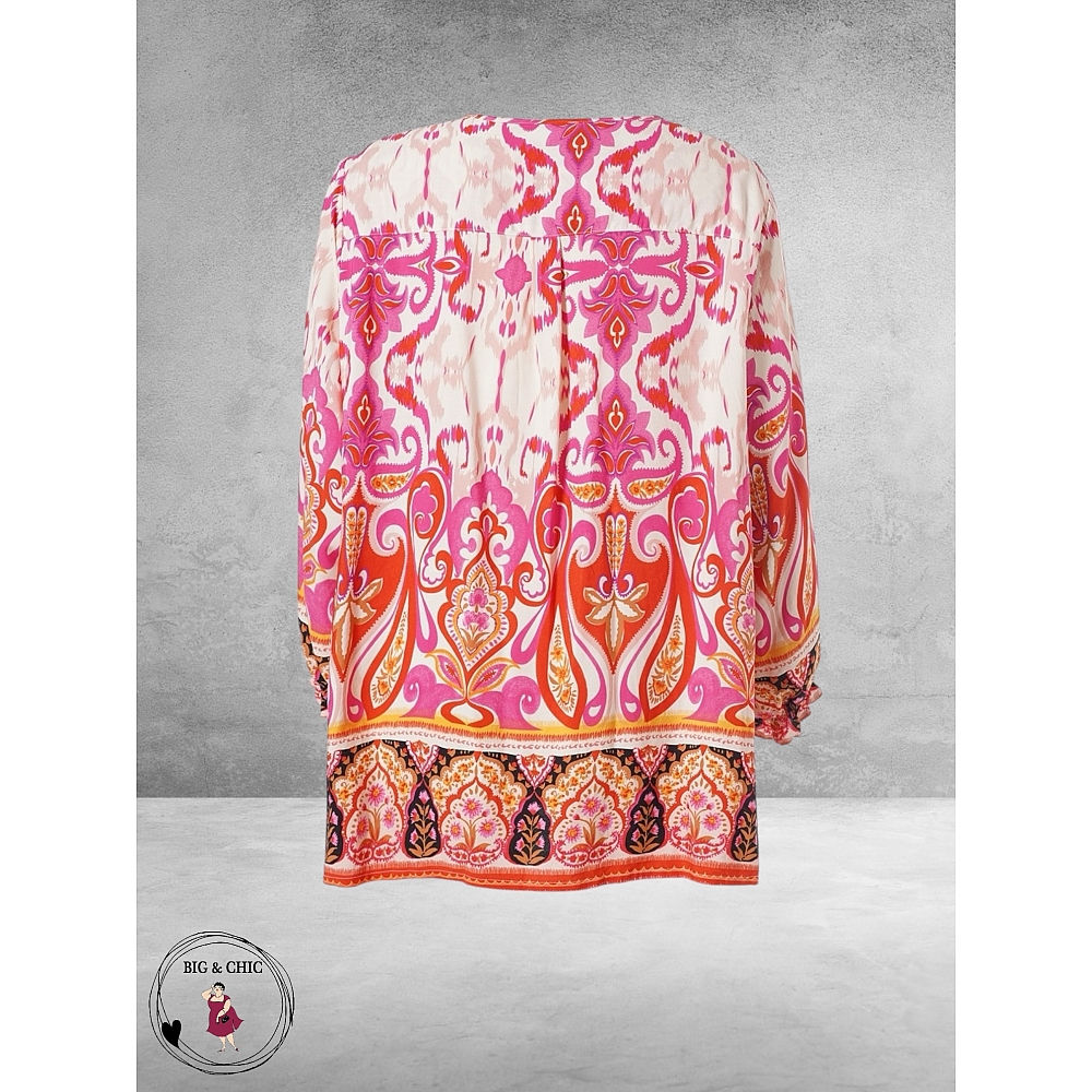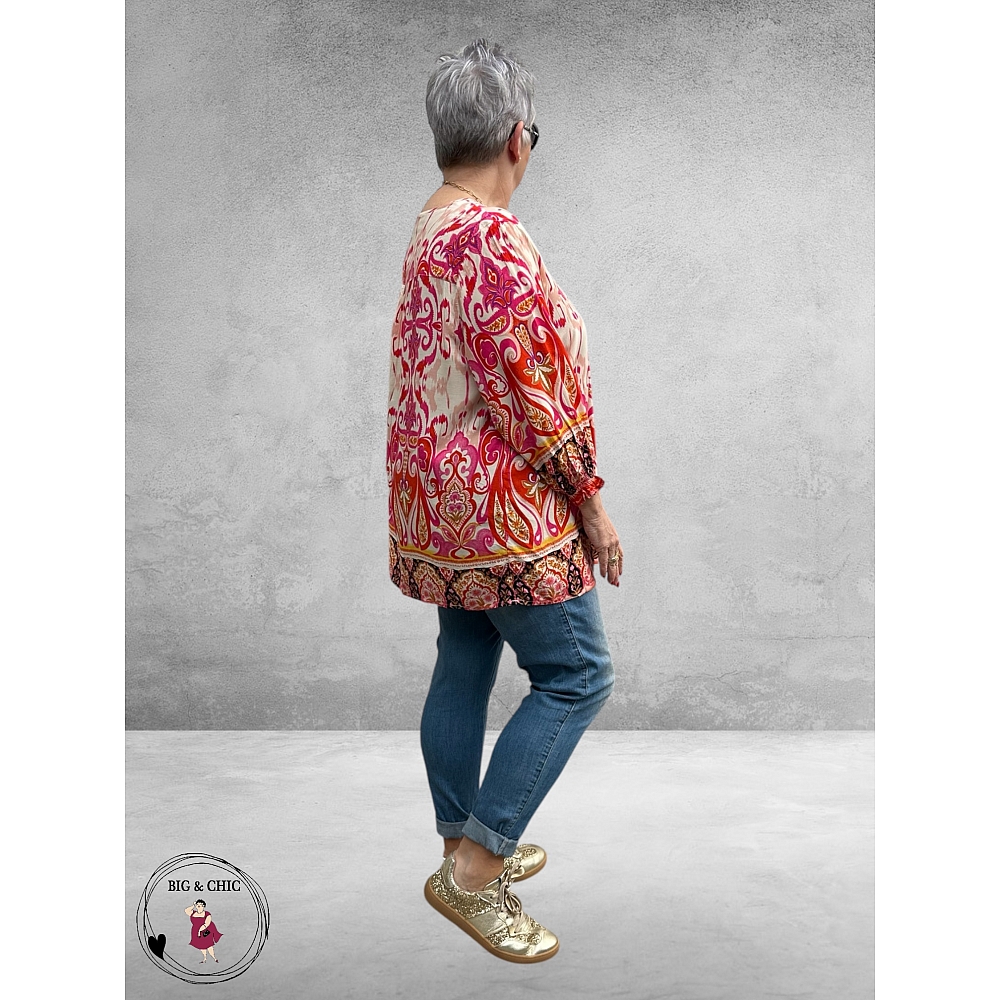 De prachtige print in pink, oranje, crème en zwart geeft deze blouse een uitgesproken bohemian uitstraling – perfect voor een zomerse, stijlvolle look.