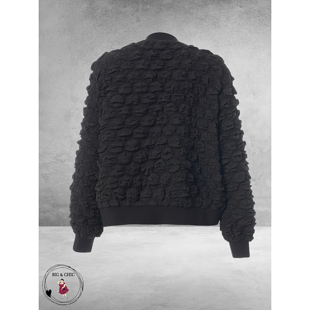 De stof heeft een speels, gekreukeld effect dat het jasje een modieuze en moderne uitstraling geeft. De bomberstijl met ritssluiting en lange mouwen zorgt voor een tijdloze look die je moeiteloos combineert met zowel casual als chique outfits.