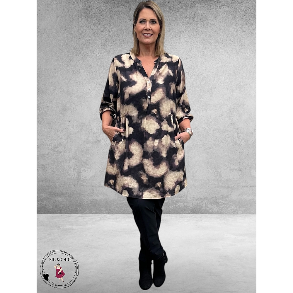 Deze mooie tuniek straalt pure herfstgezelligheid uit met haar warme cloud print in prachtige seizoenstinten.