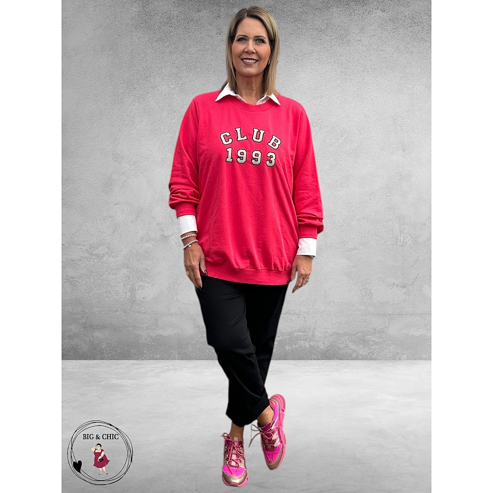 Super mooie  casual sweater  Club 1993 in rasberry met zandkleurige print en borduursel .