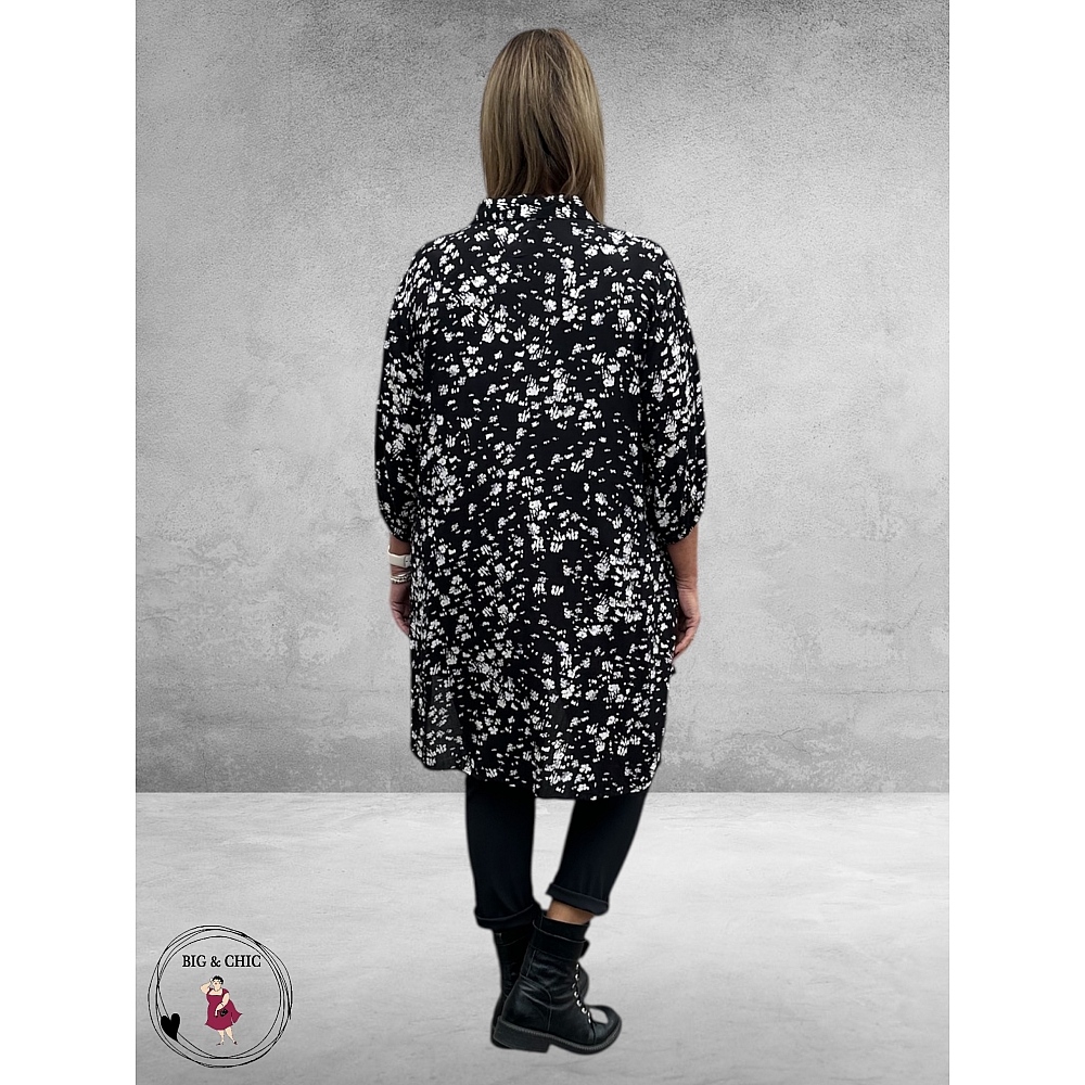 Deze lange zwarte dames tuniek blouse met witte print van het merk KAFFE CURVE heeft een losse pasvorm.