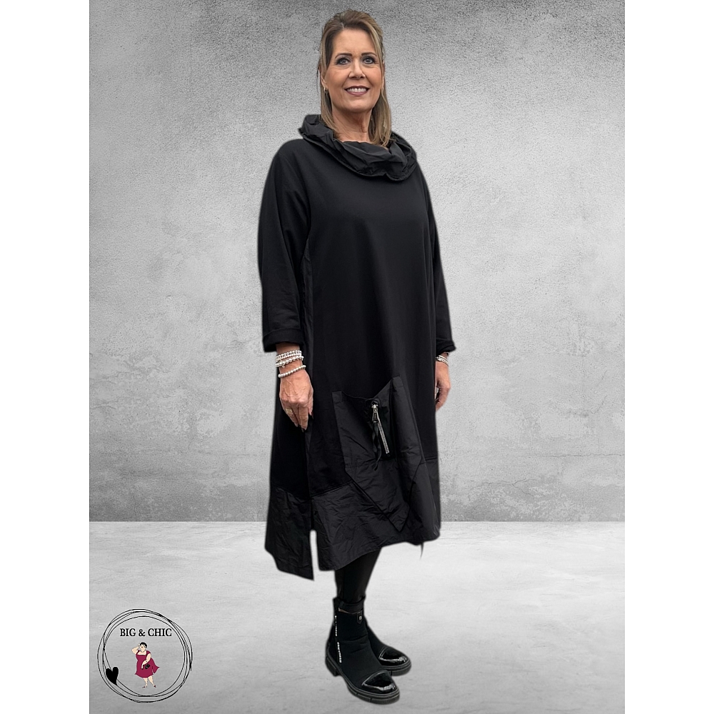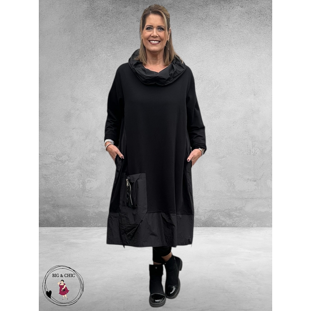Sinne Design zwarte jurk met losse ruime col-kraag en gladde stofaccenten.