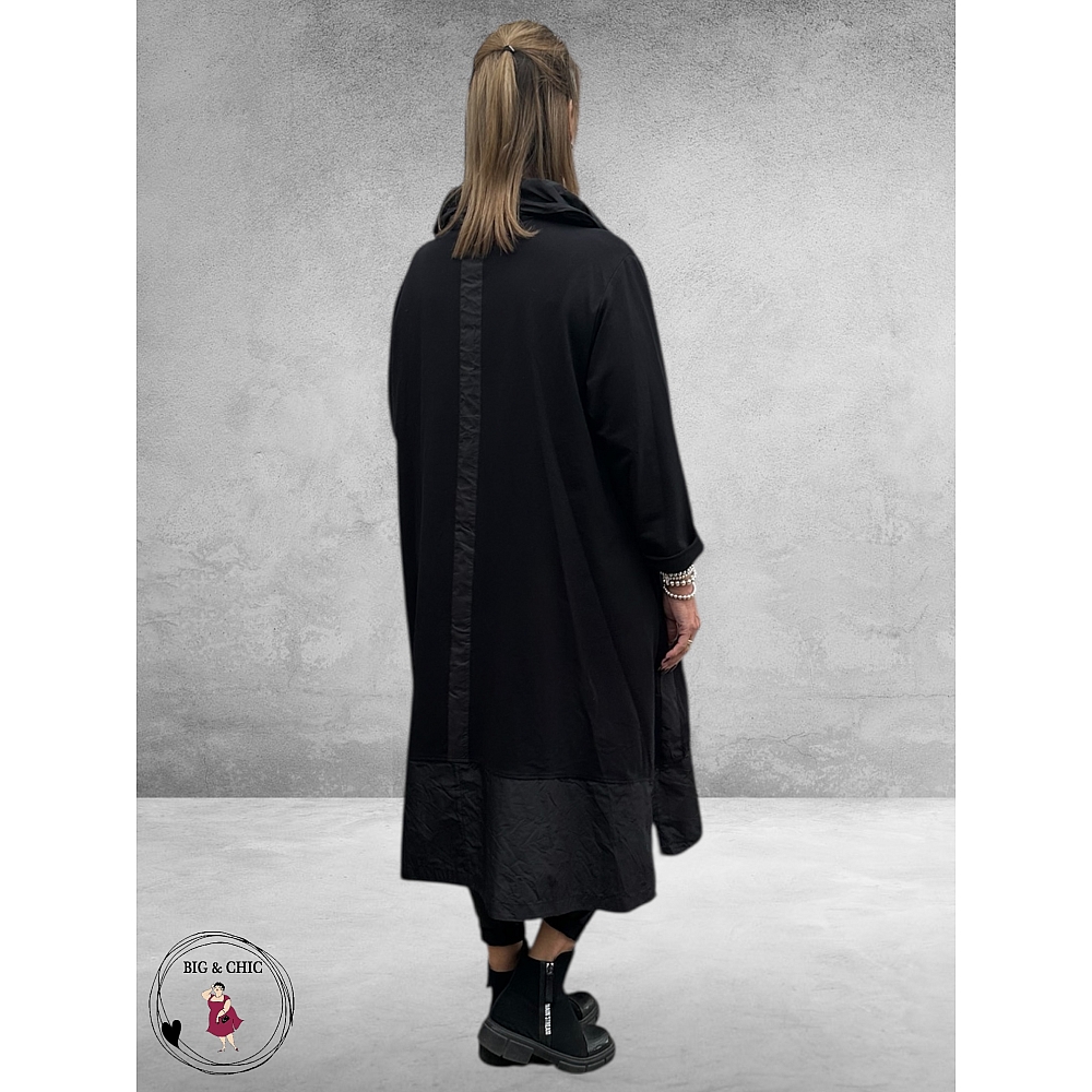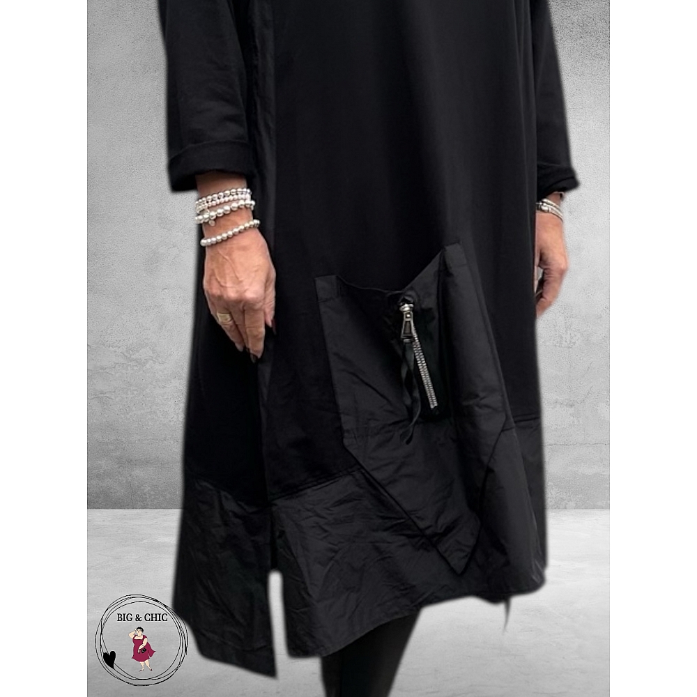 Prachtige zwarte jurk van Sinne Design met een moderne, speelse uitstraling door de combinatie van katoenen stof met gladde polyesteraccenten.