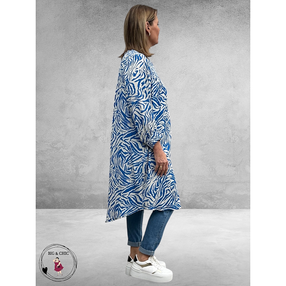 De frisse blauw-witte print geeft de jurk een stijlvolle en zomerse uitstraling die makkelijk te combineren is.