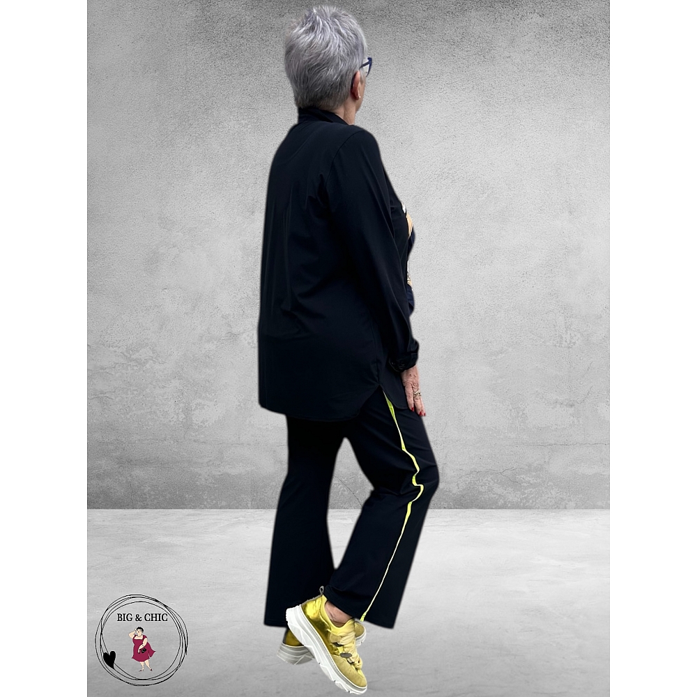 De opvallende neongele piping (sierbies) langs de zijkanten geeft de broek een trendy, sportieve edge — perfect voor een casual look met sneakers, maar net zo stijlvol te dragen met een blazer en hakken voor een elegante, fashionable outfit.
