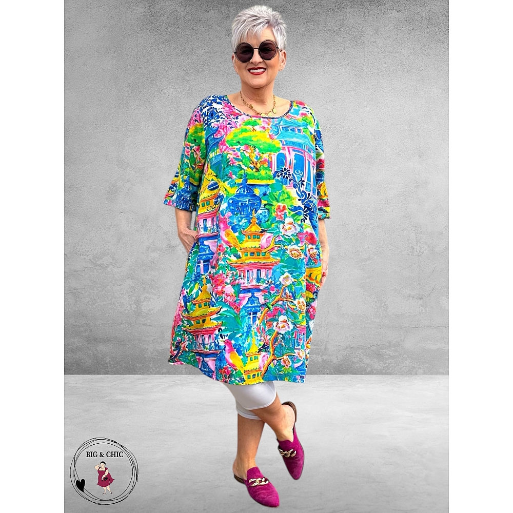 De jurk is gemaakt van 100% rayon, een heerlijk luchtige en ademende stof die perfect is voor warme dagen. Een ideale jurk om solo te dragen – stijlvol, comfortabel en opvallend door de bijzondere print.