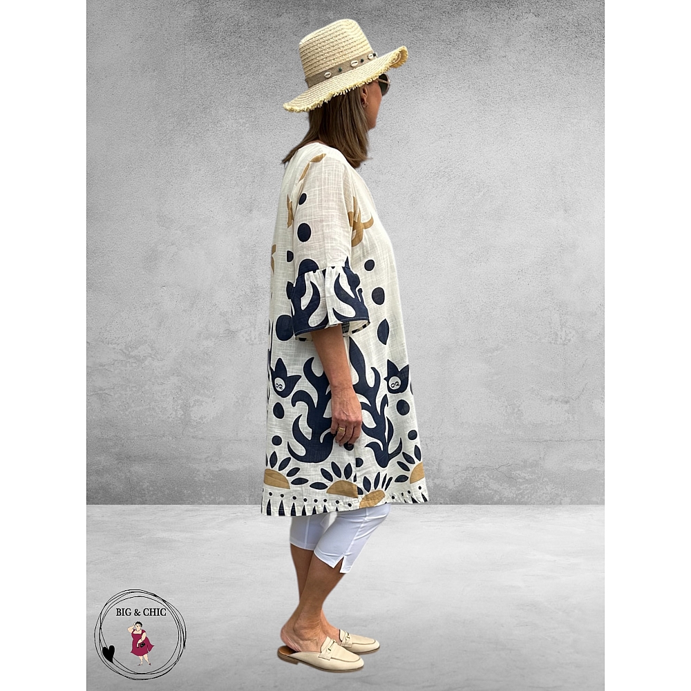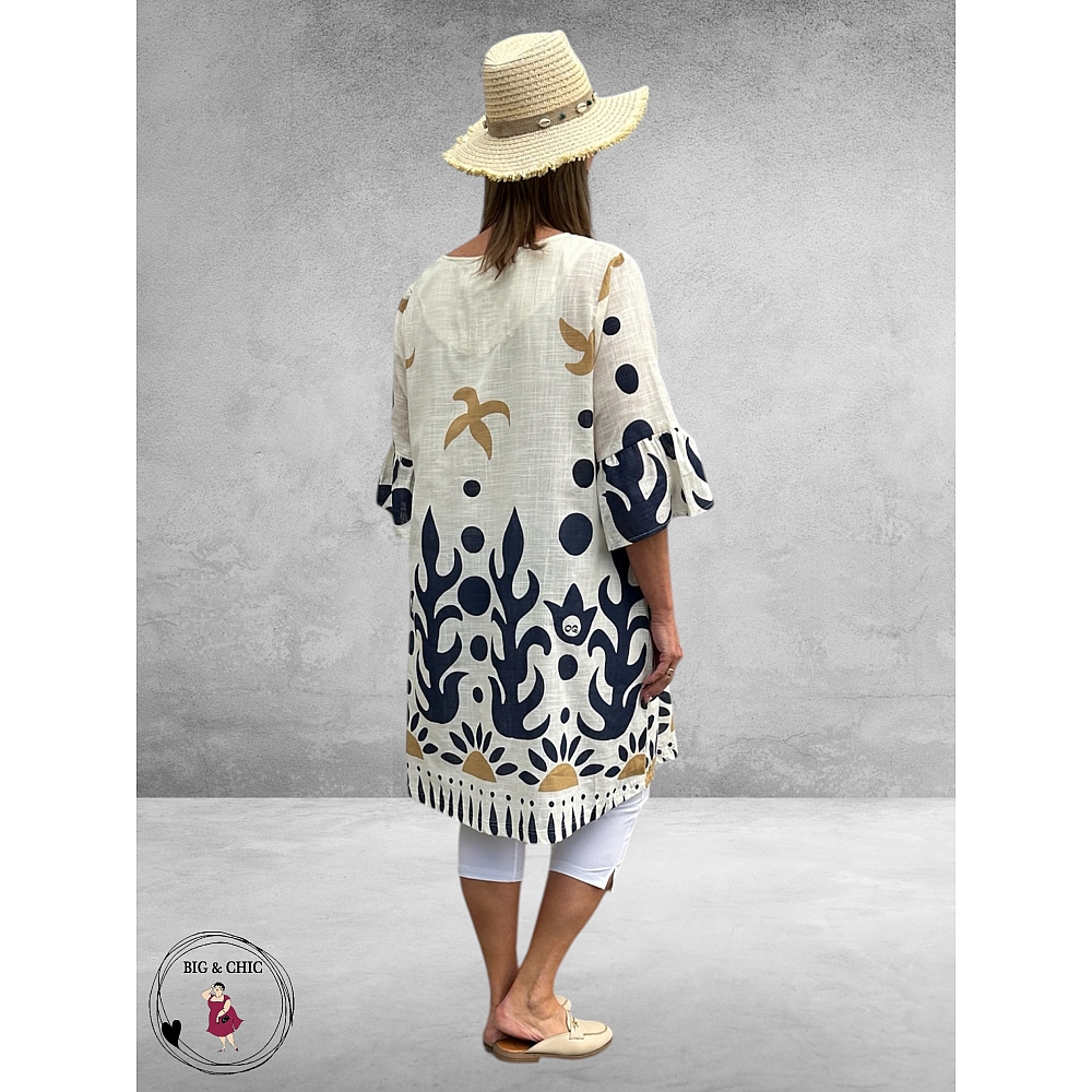 De prachtige blauwe en beige print komt schitterend tot zijn recht op de frisse creme ondergrond en geeft de jurk een vrolijke, zomerse uitstraling.