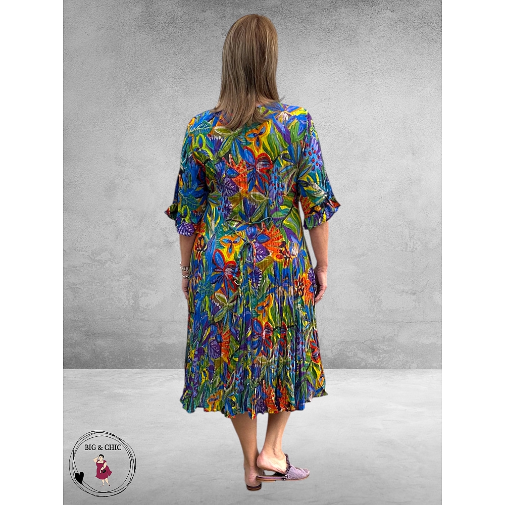 De prachtige botanische print in tinten blauw, rood, groen, oranje en geel geeft de jurk een frisse en levendige uitstraling — perfect voor zonnige dagen.