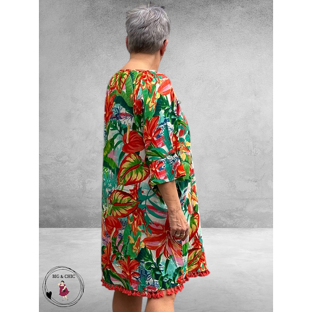 De levendige print toont een schilderachtig florale landschap met kleurrijke planten , waardoor de jurk direct een zonnige, vakantieachtige uitstraling krijgt.