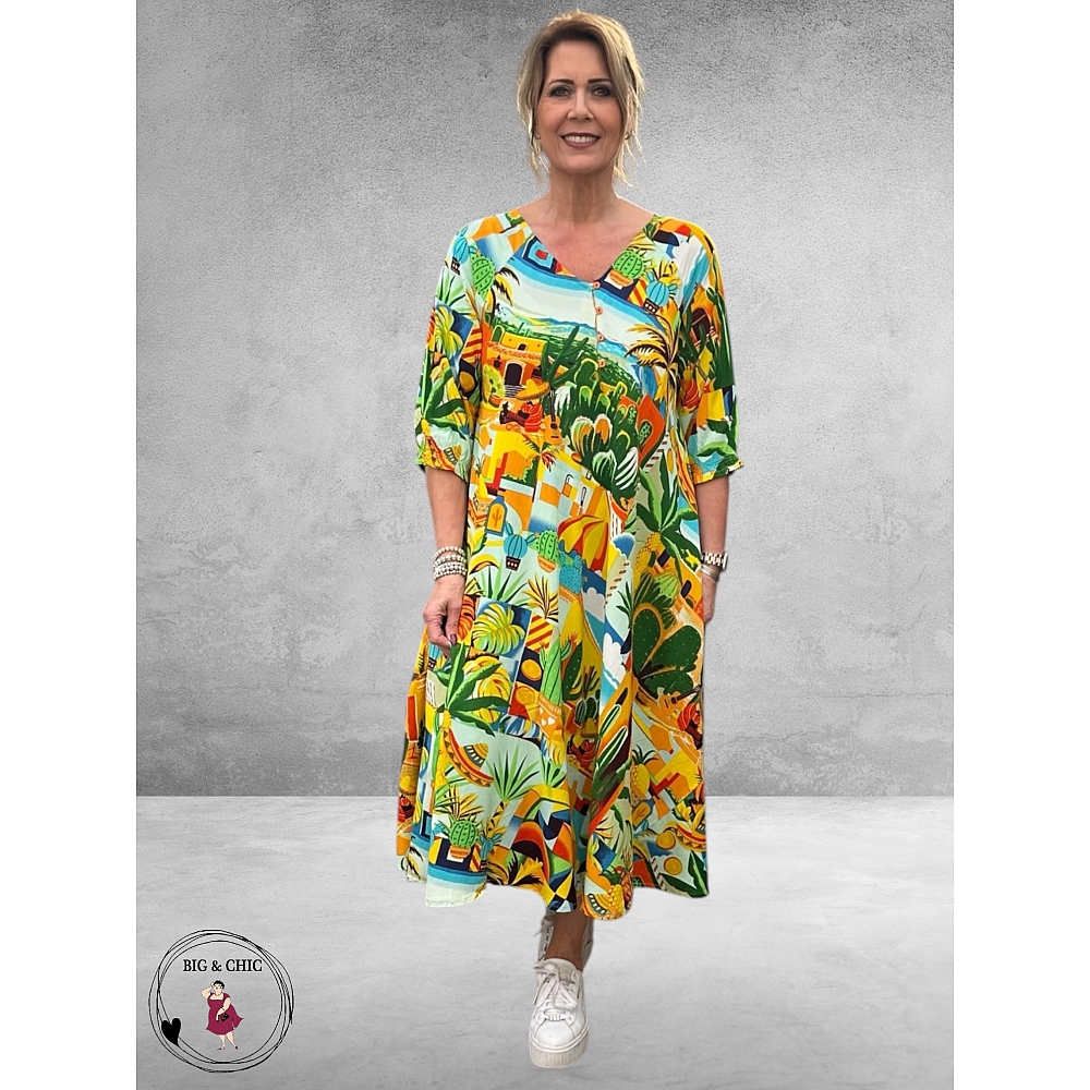 De levendige print vol tropische kleuren en speelse illustraties geeft deze jurk een unieke, artistieke uitstraling.