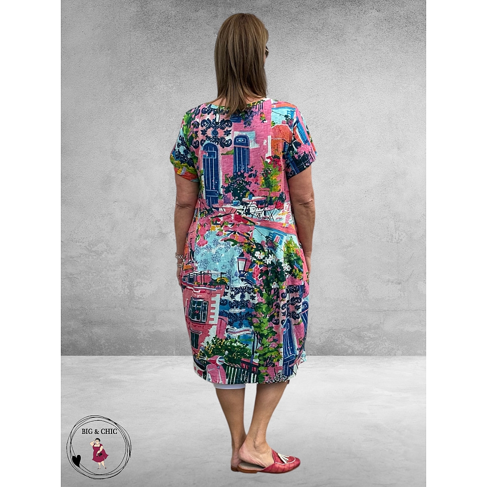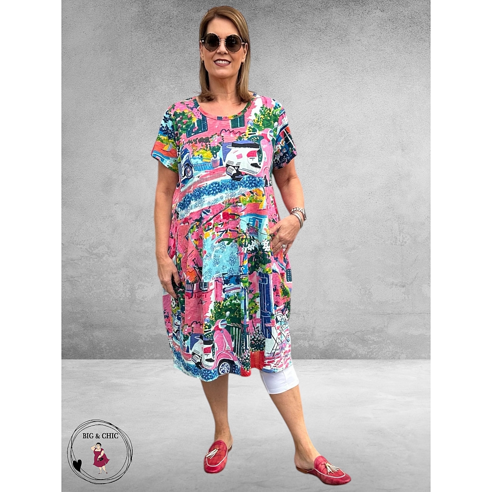 De vrolijke Scooter-print geeft de jurk een speelse en zomerse uitstraling. De kleurenmix van roze, pink, fuchsia, blauw en aqua zorgt voor een frisse en levendige look die perfect past bij zonnige dagen.