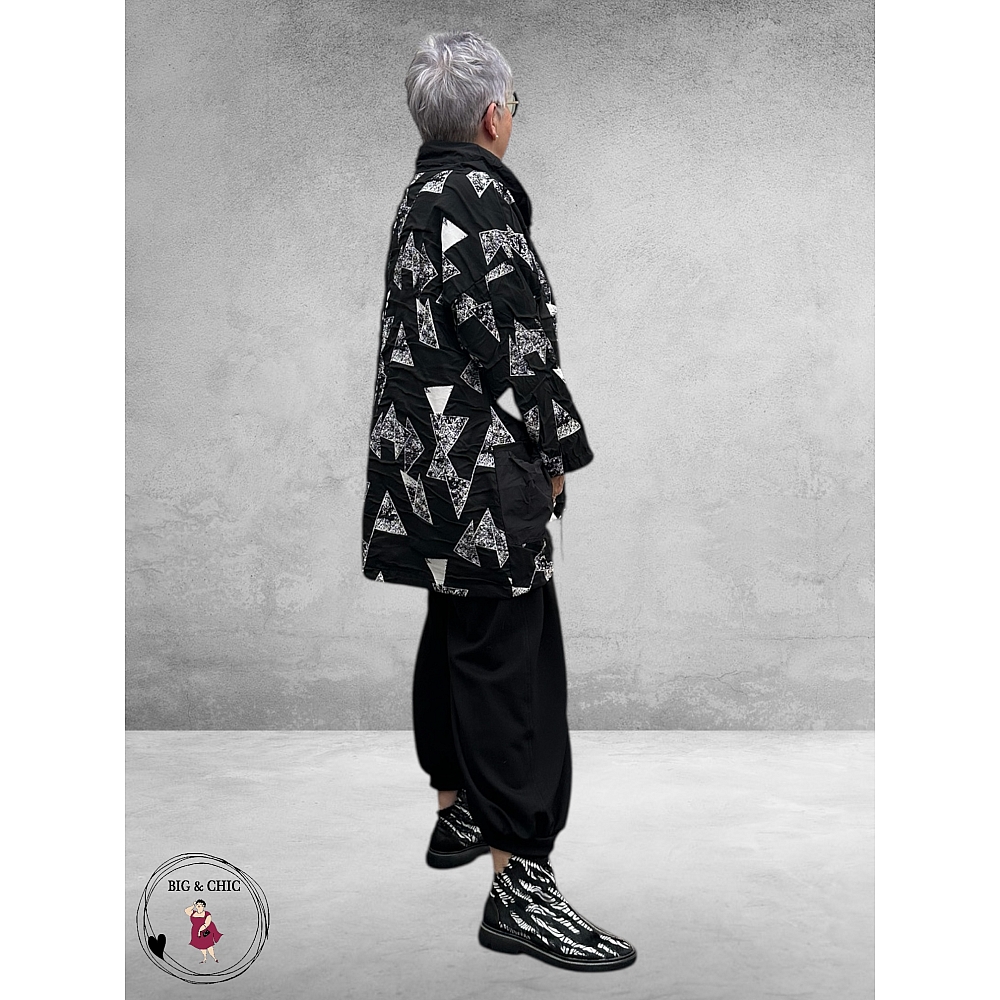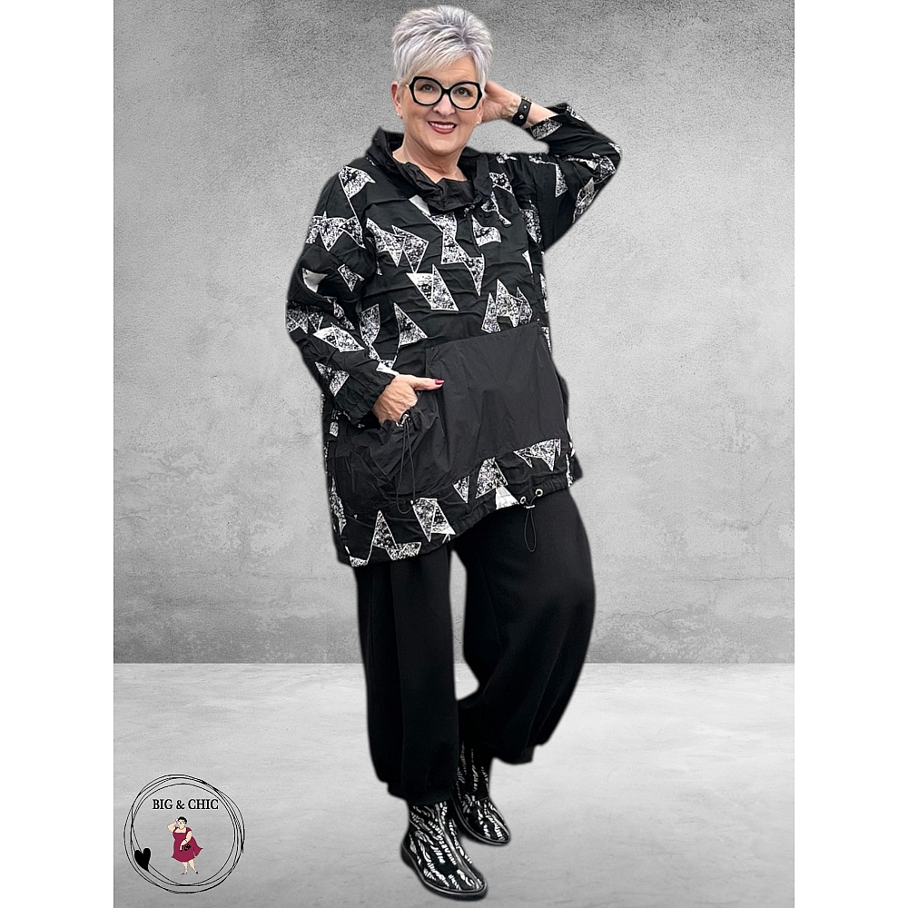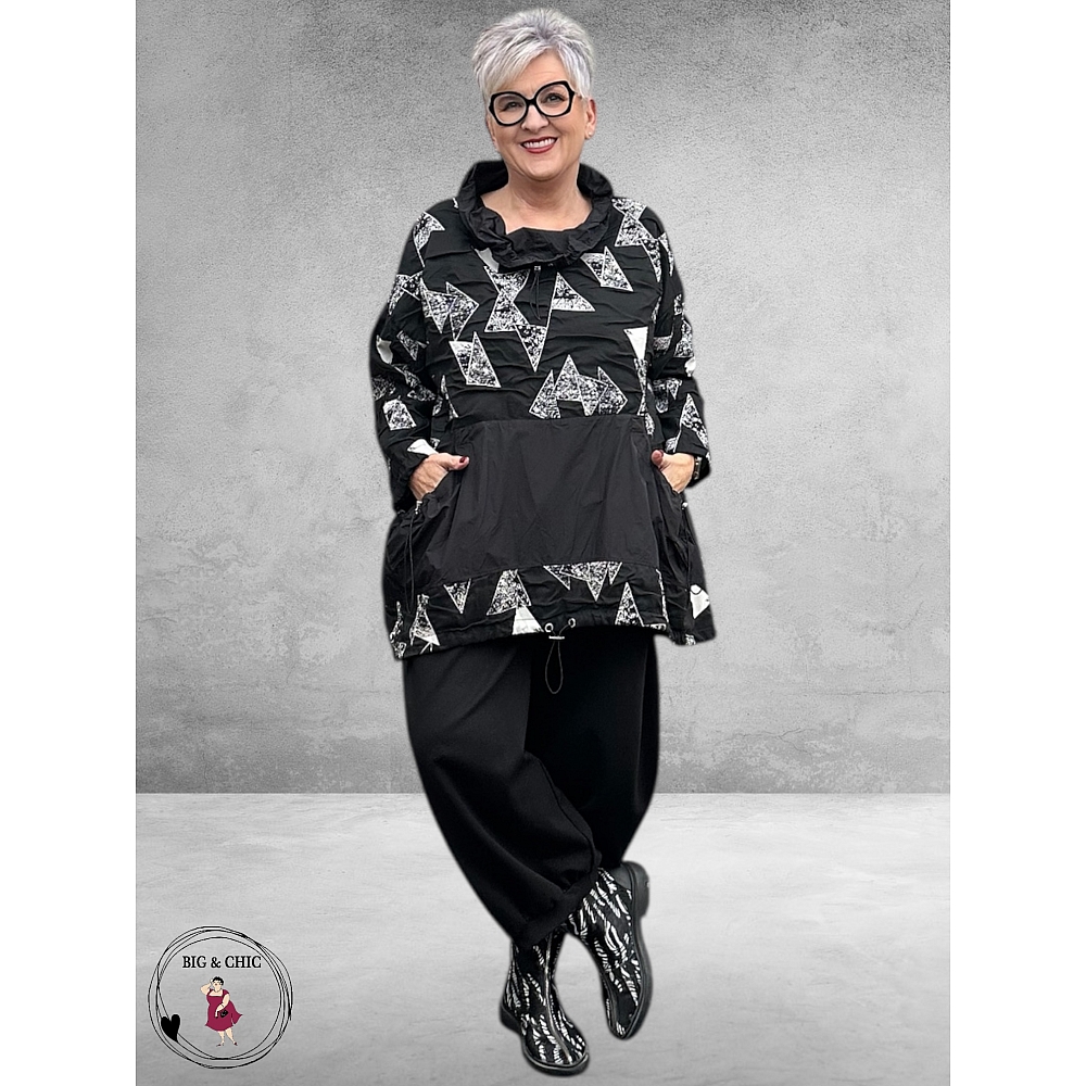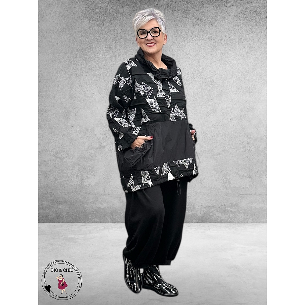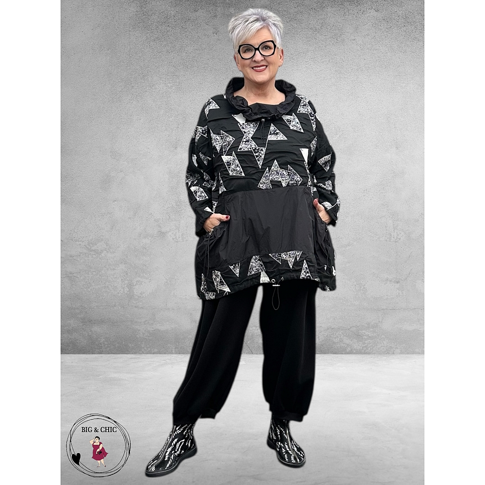 Het zwarte dessin met witte driehoekjes, afgewerkt met een zwarte bewerking, geeft de tuniek een moderne en eigenzinnige uitstraling.