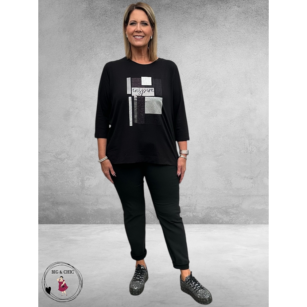 De glinsterende zilveren opdruk met steentjes en de tekst Inspire zorgen voor een chique, opvallend detail dat je outfit direct laat stralen.