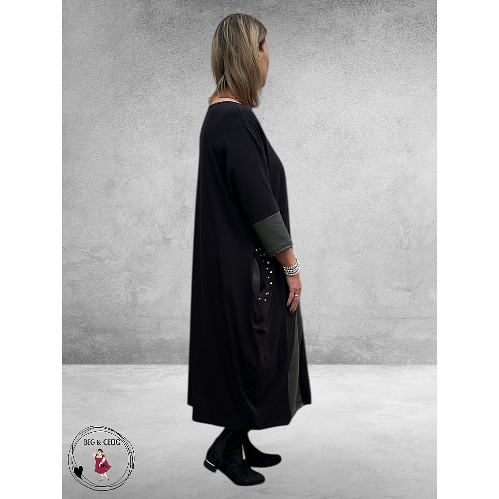 Aan de voorkant geven brede, schuine inzetten van leerlook in mudkleur de jurk een modern, verfijnd contrast.